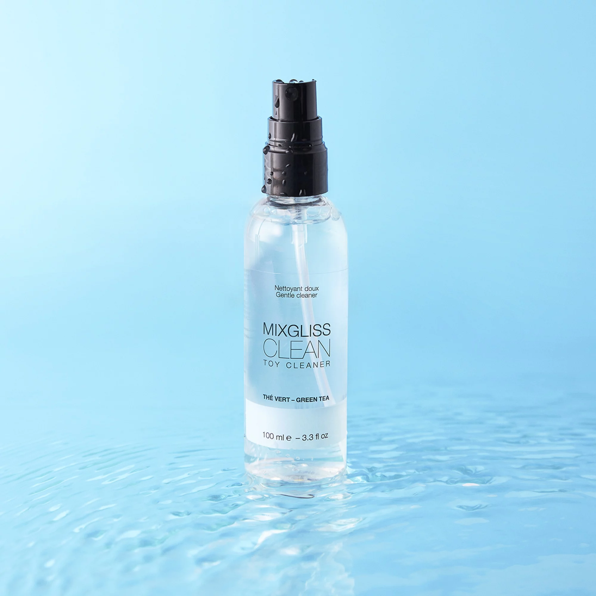 Едно от първите неща, които трябва да си осигурите- в мига, в който се сдобиете с играчка или аксесоар за възрастни, е почистващ спрей. Вариантът на Mixgliss е формулиран без алкохол и оцветители. Има свеж аромат на зелен чай, а нежната му формула дезинфекцира идеално. Съвместима е с масово използваните материали на пазара- силикон, метал и стъкло.
