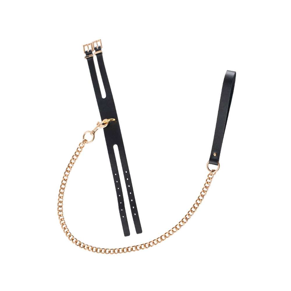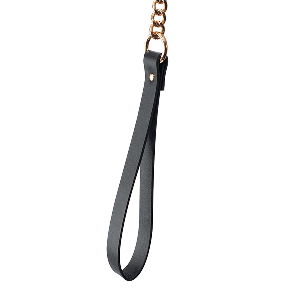 Свързващата верижка се добавя с помощта на карабина в единия си край. Поводът е метален- здрав и устойчив. Той е в ярък златист цвят и завършва с дръжка от веган кожа за повече удобство.